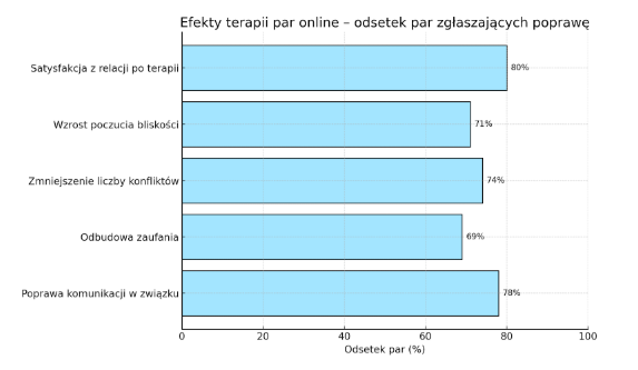 - Aż 70–80% par korzystających z terapii online deklaruje poprawę jakości relacji po kilku sesjach.